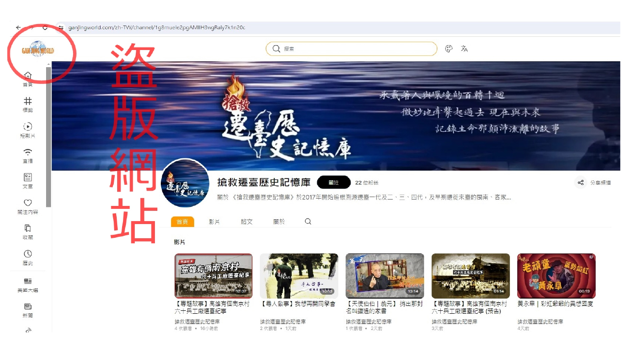 ↑圖說:Gan Jing World盜用「搶救遷臺歷史記憶庫」YT內容侵犯版權。(圖片來源:財團法人沈春池文教基金會提供)