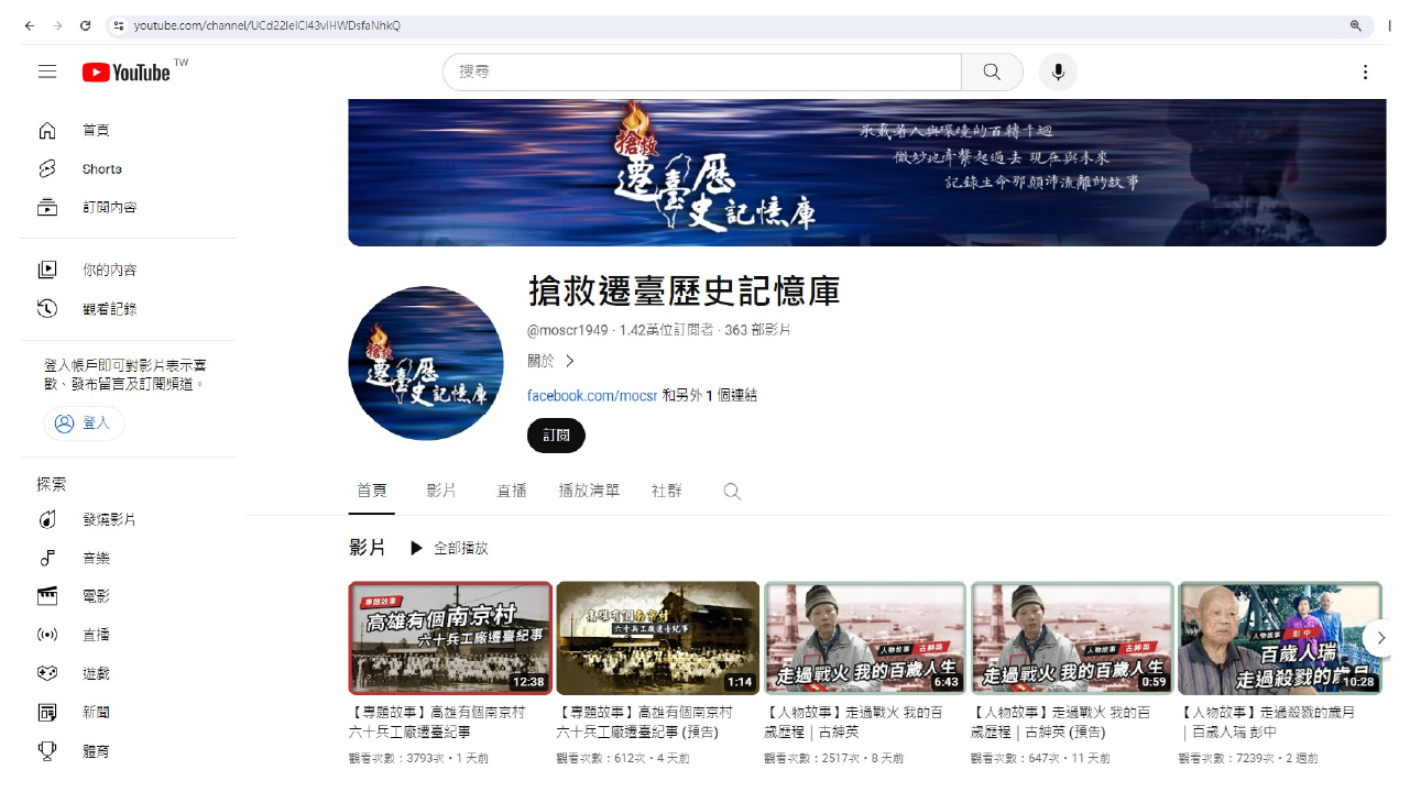 【搶救遷臺歷史記憶庫YouTube】 https://www.youtube.com/channel/UCd22leiCI43vlHWDsfaNhkQ