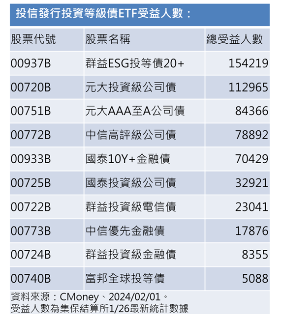 除此之外,00937B的受益人數為15萬4219人,也是投資等級債ETF之冠,相較掛牌當周的6萬4679人,成長近138%,可說是人氣爆棚。
