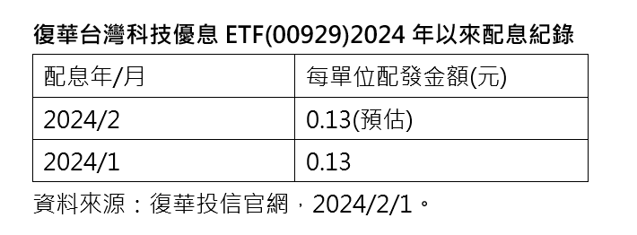 引領台股ETF月配息風潮的復華台灣科技優息(00929),上個月配息金額從0.11元提高至0.13元,此次初估維持0.13元。復華投信指出,採平滑化配息策略,將今年起,主要成分股陸續除息的股利及去年累積的股息收益,平均分配到每個月份,以維持配息金額的穩定性。