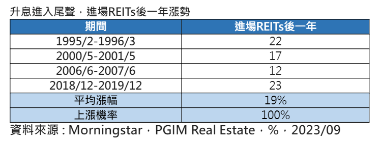政策利率穩定,有助增添REITs投資吸引力!保德信統計1995年以來,四次升息尾聲後的數據,當美國聯準會結束緊縮週期之後的一年,被壓抑的REITs市場通常能展現雙位數的反彈行情,上漲機率高達百分百,且平均能達到將近兩成的漲幅,反映出利率環境對於REITs市場的影響。