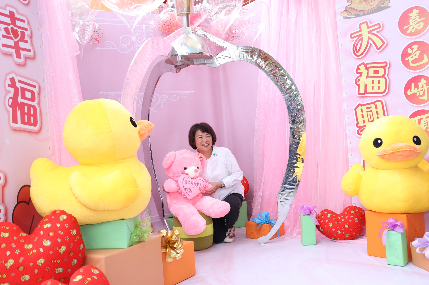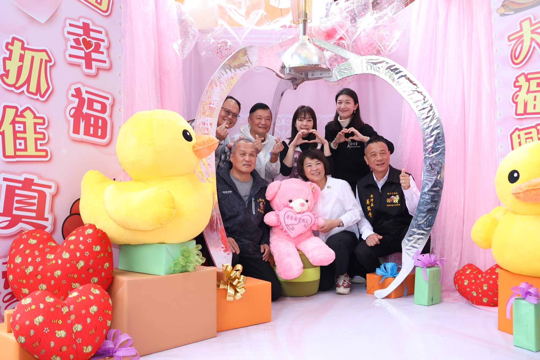 黃敏惠表示,大年初五適逢2月14西洋情人節,感謝大福興宮用心規劃活動,結合傳統與現代節日,以拋繡球方式為讓更多未婚男女有機會進一步認識,相信有月老相助,一定能促成更多佳偶覓得真愛。也感謝民間力量加入,與市府公私協力,鼓勵年輕男女組成家庭,並以奶嘴、嬰兒鞋襪等可愛禮品鼓勵生育。市府也以安心生養政策,支持青年產前、產後無憂,補助孕婦乘車券4,500元,亦設有生育津貼,並照護媽媽產後身心修復。全台首創產後1個月提供40小時免費到宅坐月子、提供育有6歲以下幼兒之家庭育兒指導,並提供育有未滿3歲兒童家庭臨時與短期托育,讓 「生育有津貼、托育沒煩惱、教育有希望」。