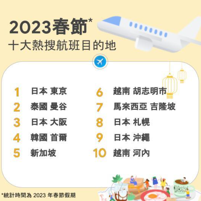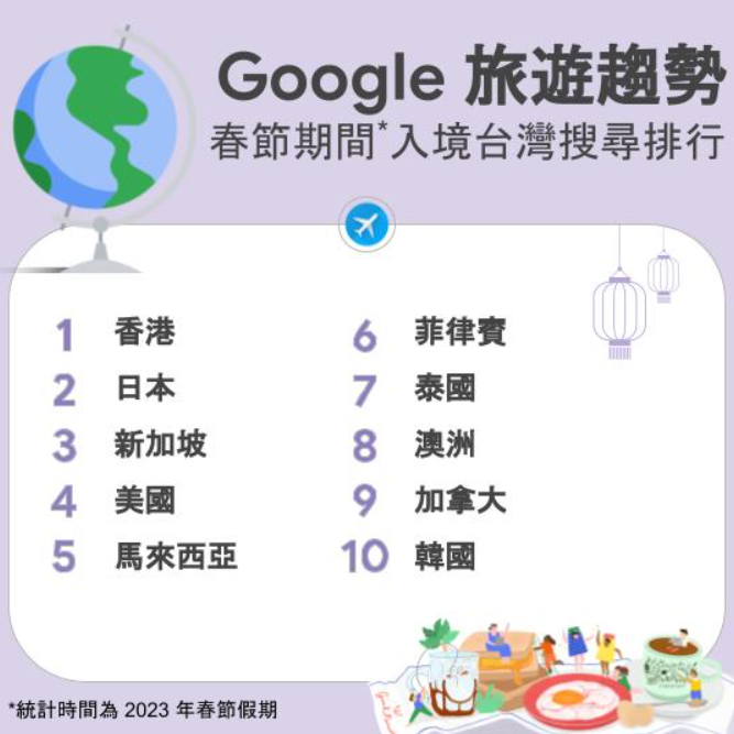 至於去(2023)年春節期間( 1月20日至1月29日之間)以台灣為目的地進行機票、飯店搜尋的海外遊客,以香港遊客居冠,其次是日本、新加坡等地,來自美國、加拿大的旅客,也對春節期間造訪台灣有高度興趣。