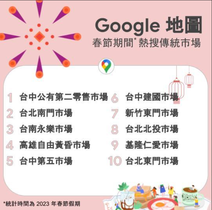年節前後,許多台灣人會到傳統市場採買年貨,Google觀察去年春節期間 Google 地圖上十大熱搜的傳統市場,發現台北和台中各有三處上榜、地點最多,而高雄、新竹、基隆、台南則分別有一處市場上榜。