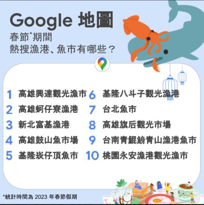 去年春節期間 Google 地圖上最熱門的台灣魚市熱點,第一名是高雄興達觀光魚市,第二名是高雄蚵仔寮漁港,第三名是新北富基漁港。整體來說,高雄有4 個魚市榮登前十名,基隆則有崁仔頂魚市、八斗子觀光漁港兩處上榜。