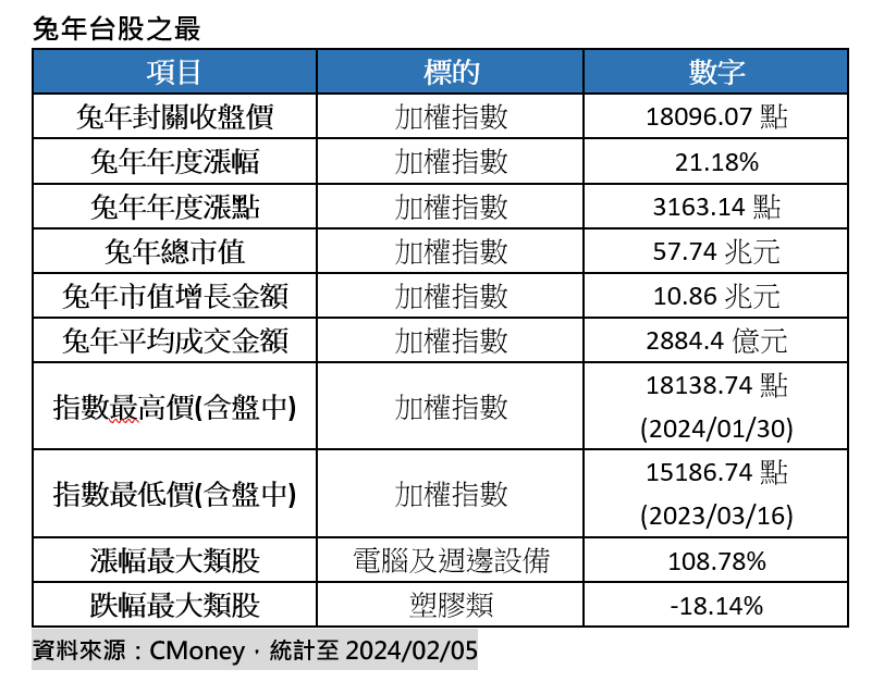 整體而言,兔年台股呈現先蹲後跳,指數最低出現在2023年3月16日盤中的15186點,最高則是於今年1月30日盤中來到18138點。