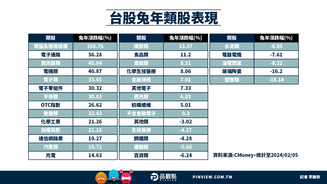 分析兔年各類股表現,在AI與半導體產業的挹注之下,帶動電腦及周邊設備指數於兔年強彈108.78%最出色,其次是電子通路的56.28%,資訊服務、電機類指數的漲幅也超過四成,反觀傳產中的塑膠類股下跌18.14%墊底,玻陶指數下跌16.2%,是唯二跌幅超過一成的類股。