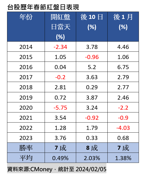 華南投顧董事長儲祥生認為, 參考台股過往的年後開紅盤行情,除非過年休市時間出現重大事件,否則,台股通常是上漲的,目前看來,今年應該也是上漲機率較大。