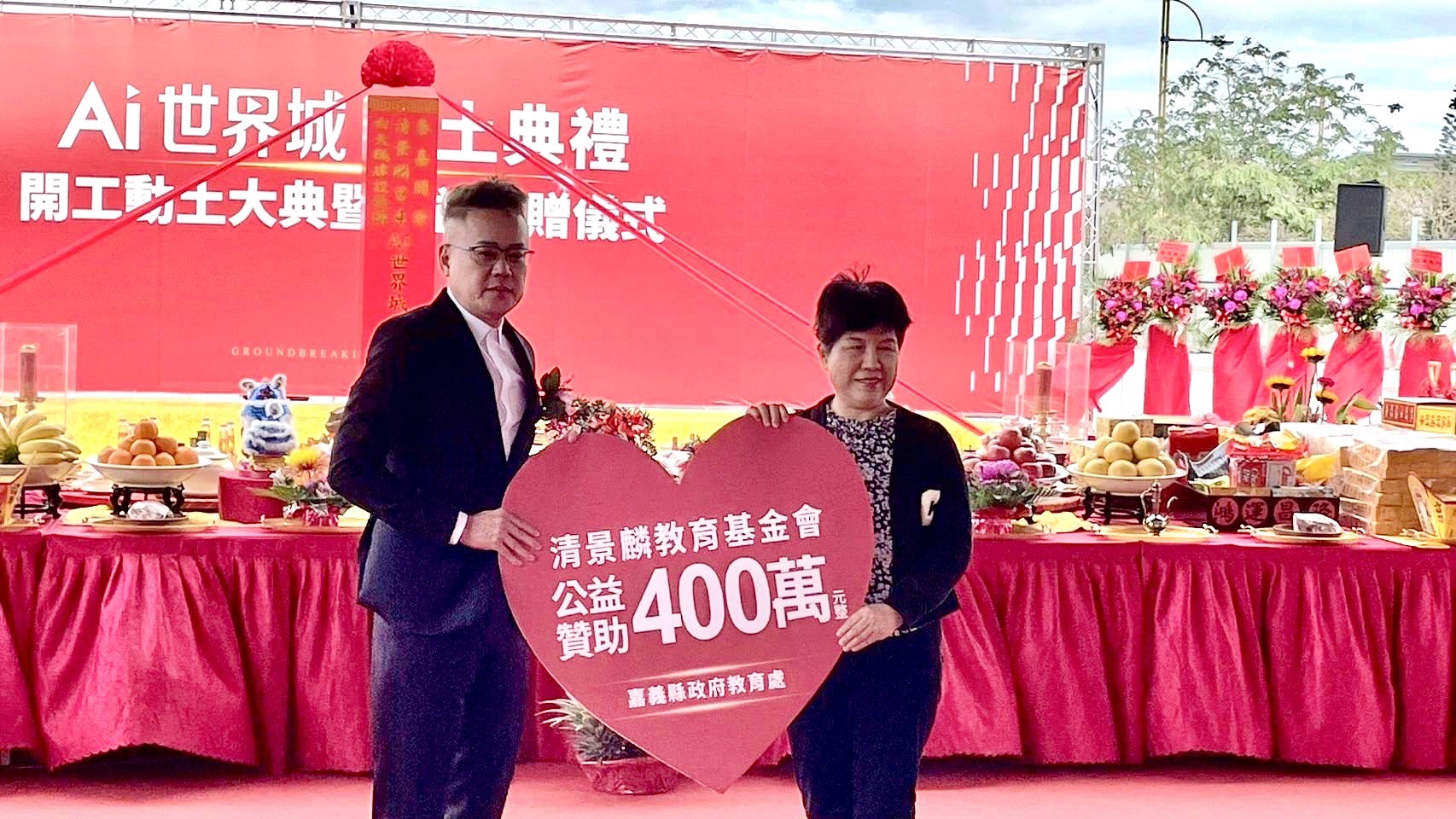 台積電將在嘉義科學園區設廠議題傳出,帶動園區周邊房市,許多建商紛紛準備進駐,南台灣知名建商清景麟集團攜手白天鵝建設及泰嘉開發三強聯手,在長庚醫療縣治特區,共推超大花園造鎮「Ai世界城」,5日舉辦動土典禮。現場並頒發竹崎高中比賽贊助基金,並承諾捐贈嘉義縣教育處教育基金。