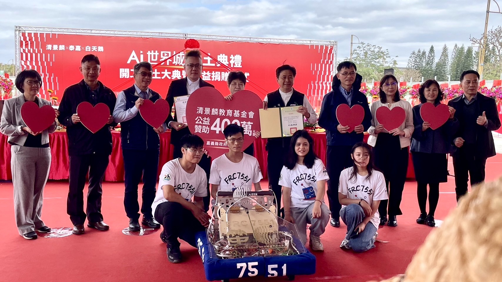 嘉義縣政府教育處長李美華代表接受第一階段捐助130萬元,今年3月將前往土耳其比賽的竹崎高中FRC機器人隊伍也帶來機器人熱舞演出,展現嘉義縣科技教育的成果,大展學生創意。