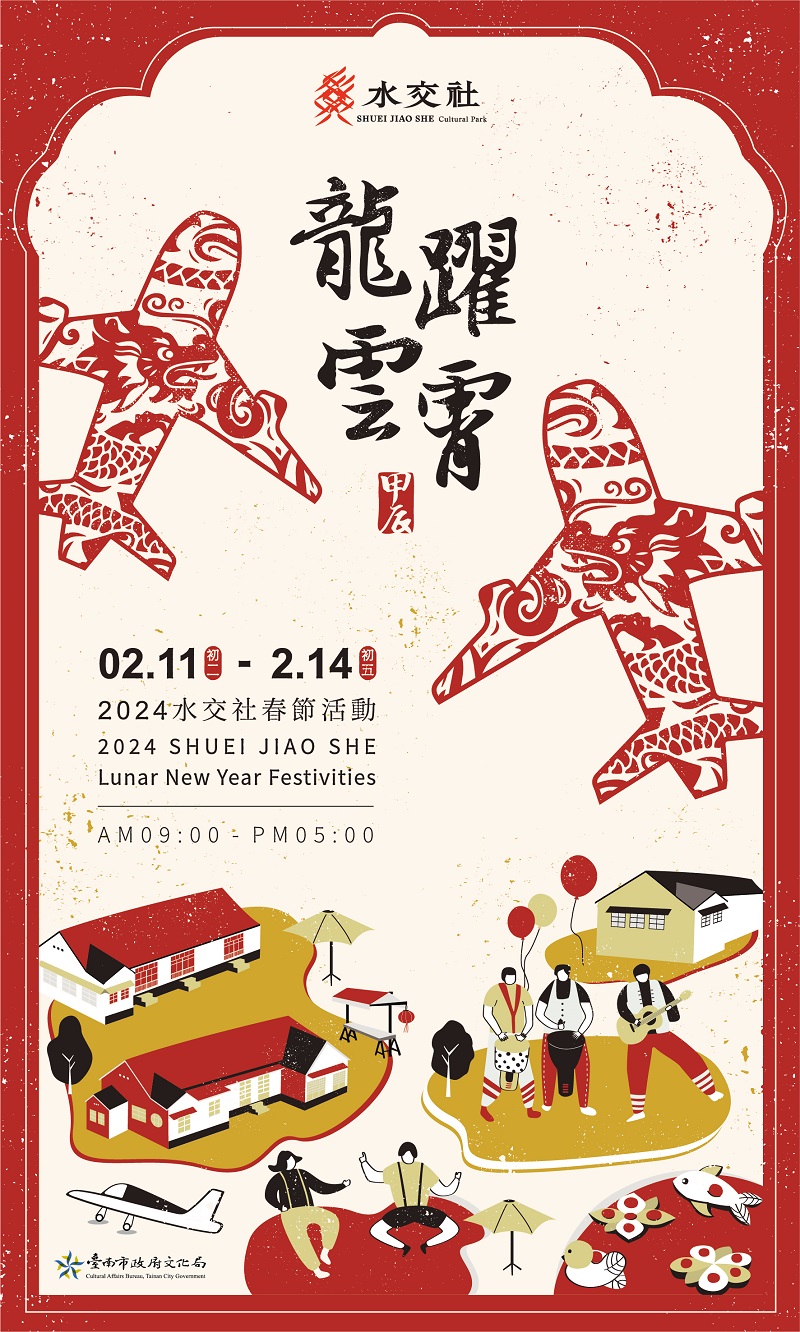 台南市文化局說明,「水交社文化園區」前身為空軍眷村,也曾是日治時期駐防台南機場的台南海軍航空隊官兵眷屬居所。春節期間推出園區內四棟展館免門票活動,包括水交社展演館《眷戀煙花燦爛的歲月》、水交社歷史館《活的歷史‧層疊的地景》、AIR台南館《直上晴空-空軍第一戰術戰鬥機聯隊特展》、飛行親子館《2023台南國際藝術節-城像、成相》等主題展都可免費參觀。