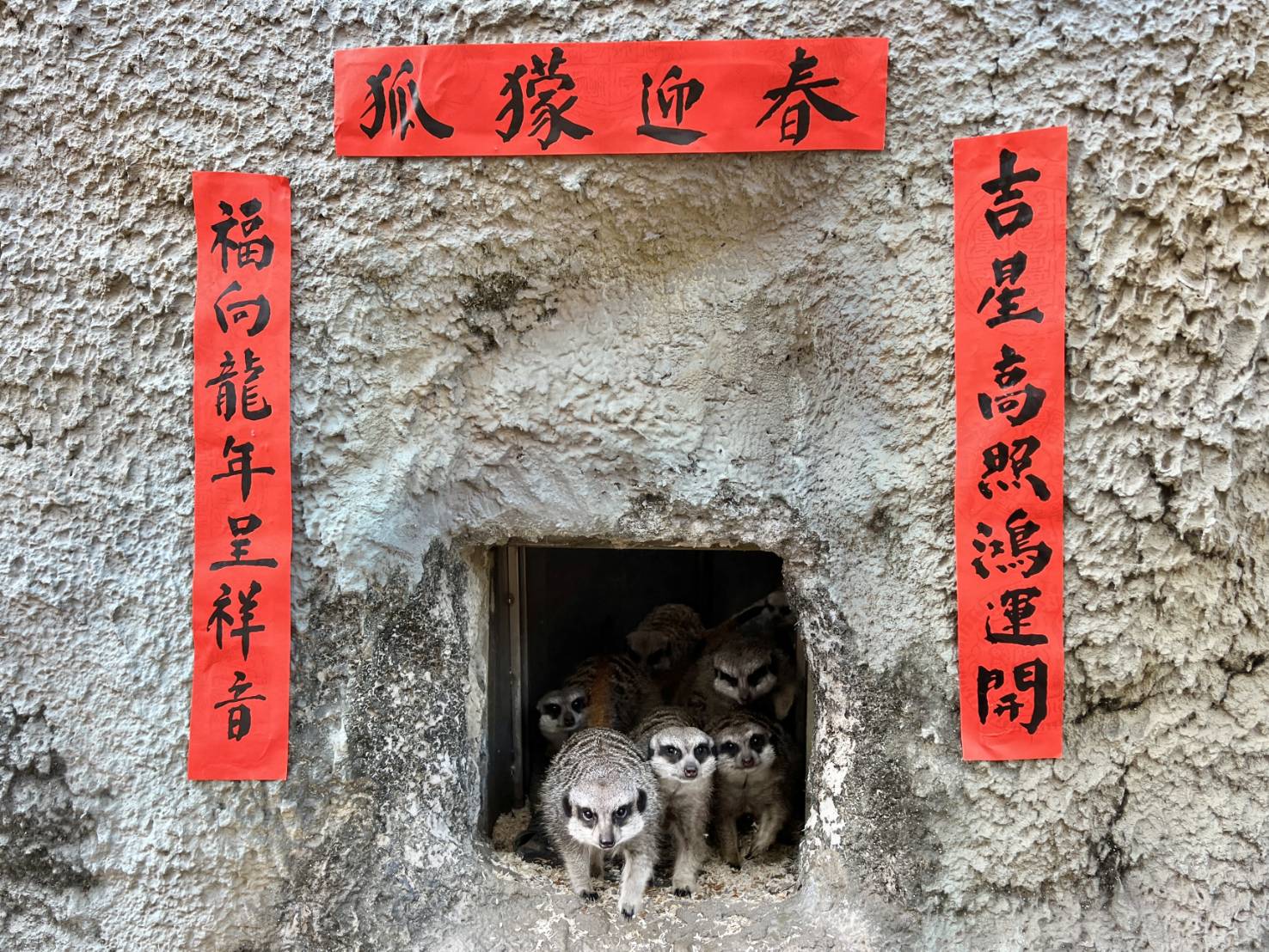 高雄市觀光局長高閔琳表示,農曆春節期間,壽山動物園全體總動員,包含同仁、志工及保育員不但除舊布新進行環境景觀布置外,也規劃季節食蔬,準備豐富蔬果,邀動物們擔任座上賓一起享用。狐獴展場的春聯是由具書法專長的志工蔡忠州親筆揮毫、葫蘆玩具則是改造志工捐贈的家中珍藏藝品!好奇心強的狐獴一看到保育員端著菜籃走來,就興奮地探頭探腦。當保育員將菜籃放在展場內,狐獴們立刻圍了上來,藉由翻動葫蘆讓麵包蟲掉出洞口,增加狐獴攝食的趣味性及延長進食的時間,增加其活動力。