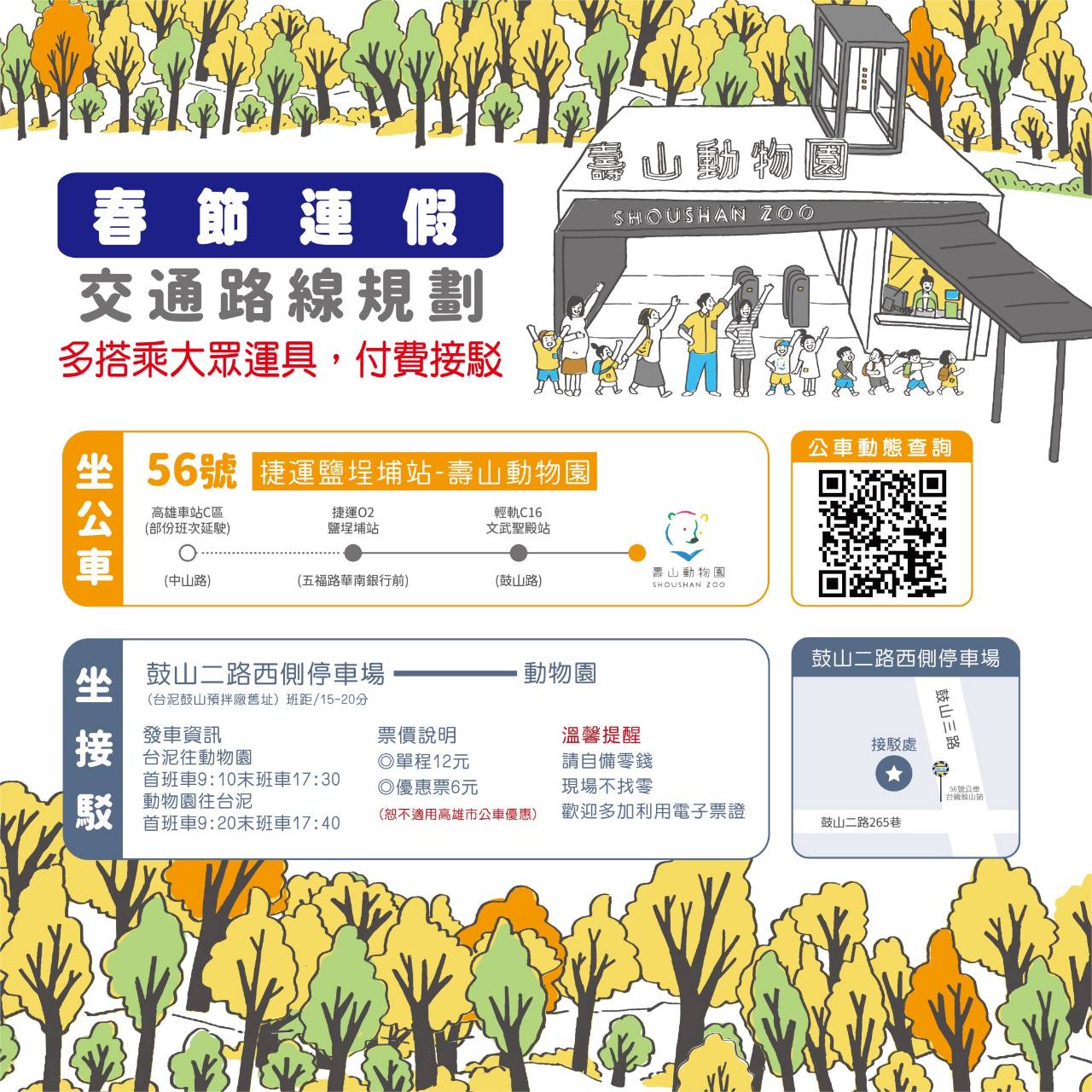 高雄市觀光局也提醒想要利用春節假期入園參觀的民眾,動物園除夕休園,春節期間正常開放,每日8時至18時,壽山實施南向單行管制,往動物園車輛請由興隆路上山。另因壽山動物園停車空間有限,呼籲民眾搭乘大眾運輸前往,以利節省等候停車空位的時間。民眾可在高雄車站、捷運鹽埕埔站及輕軌文武聖殿站搭乘56號公車(台灣好行壽山國家自然公園線)來動物園,或將車輛停放於鼓山二路西側停車場(台泥鼓山預拌廠舊址,鼓山二路274號對面),該處鄰近輕軌鼓山站及台鐵鼓山站,總計有221格汽車停車位。民眾可於此轉搭56公車或動物園付費接駁車,直達動物園大門口,歡迎民眾多加利用,使旅程更加輕鬆。另愛河灣及16-18號碼頭(輕軌旅運中心站)現正辦理「2024 Kaohsiung Wonderland 冬日遊樂園」,從1月27日至2月25日,除黃色小鴨外,也有地景裝置、遊樂設施、美食市集及藝文展演等活動,歡迎遊客順道安排一遊。有關「2024 Kaohsiung Wonderland 冬日遊樂園」更多資訊,請至「高雄旅遊網」官網(https://khh.travel/zh-tw/event/news/5714)、臉書及IG查詢。