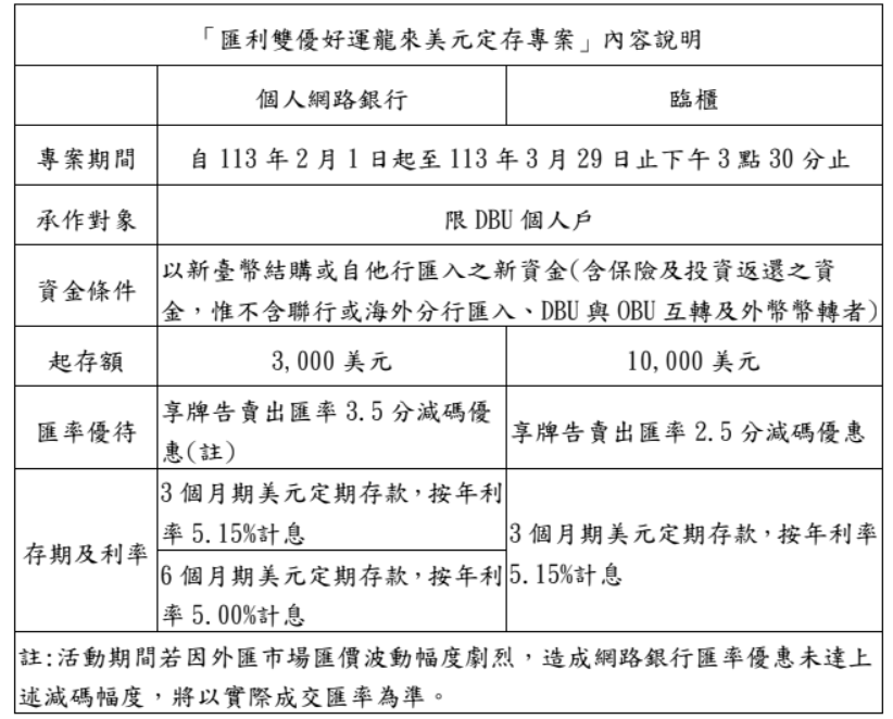 本次專案以美元新資金承作,個人網路銀行起存額為3000美元,臨櫃起存額為1萬美元,三個月期享最高年利率5.15%。另為提倡客戶多加使用數位金融服務,使用個人網路銀行以新臺幣結購美元承作專案,可再享匯率減碼3.5分優惠,讓客戶一次擁有雙重優惠。