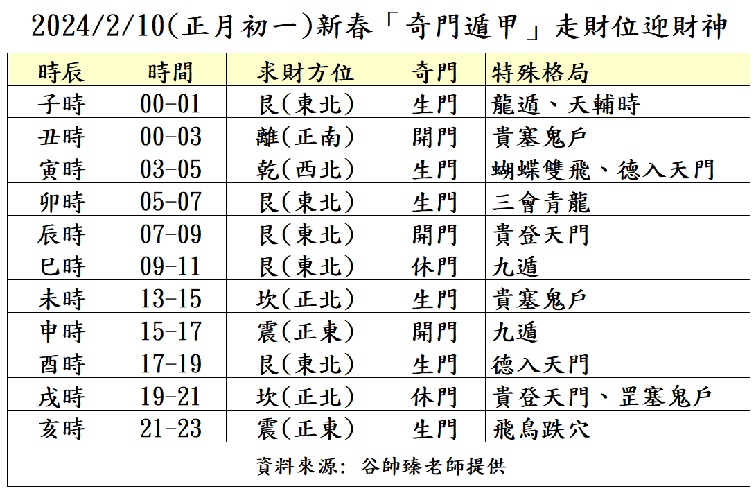 1. 甲辰年正月初一(國曆2024/2/10),「奇門遁甲」造命開運「走財位」最旺的吉時與前往財位的吉利方位如表,迎接財神時間越早越好(不要太晚起超過中午),下午至晚上的吉利時間可至廟宇祈福,走春,佈求財陣,試手氣買彩券均可。