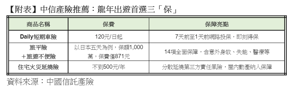 中國信託產險提醒民眾備妥「龍三保」,善用「旅平險/旅遊不便險」、「Daily短期車險」、「住宅火災延燒險」全方位轉嫁事故風險,龍年出遊龍安心。