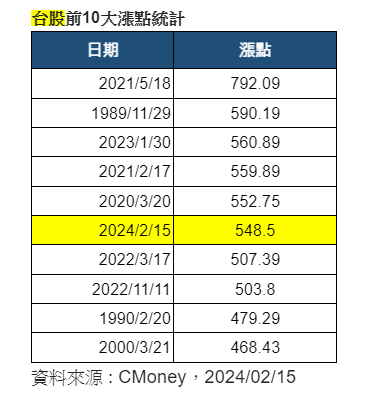 如果以所有交易日來看,今天的漲點則是台股歷來第6大。