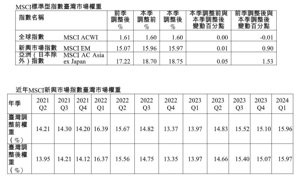 過年期間,明晟(MSCI)公司在台北時間13日上午6點,公布第1季相關指數調整,於3月1日開盤生效。台股於全球標準型指數(MSCI ACWI)權重維持不變,新興市場指數(MSCI EM)及亞洲(日本除外)指數(MSCI AC Asia ex Japan)權重上升0.01百分點及0.05百分點,調整後權重分別為1.6%、15.97%及18.75%。