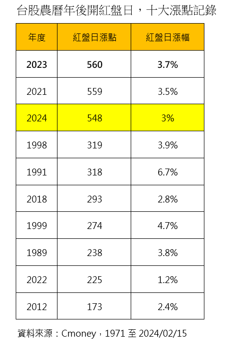龍年台股開紅盤日,發給投資人一個大紅包!一開盤就跳空狂飆568點,改寫歷史新高,盤中最高來到18725點,大漲629點,終場以18644點做收,飆漲548點,是台股農曆年後開紅盤日第3大漲點紀錄。