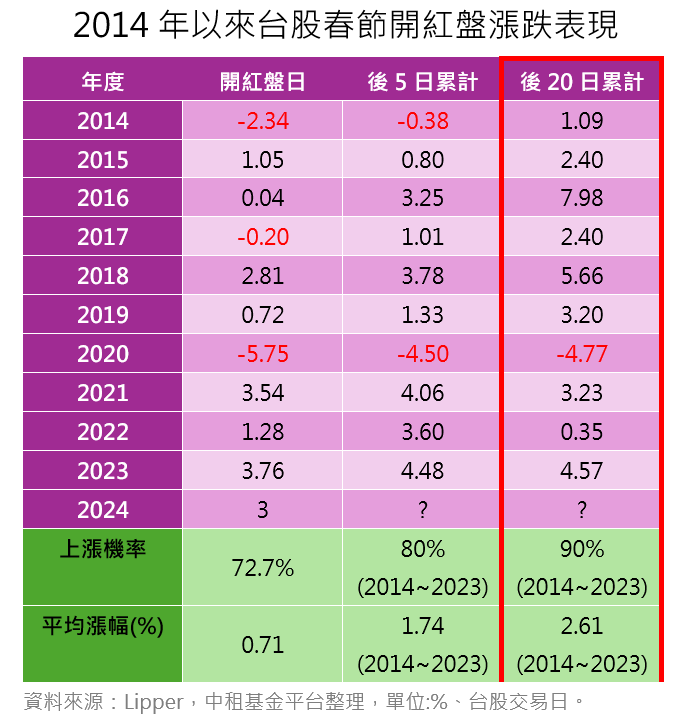 整體而言,孫傳恕說明,從歷史數據來看,春節紅盤之後台股往往可維持多頭漲勢,惟從台股企業獲利與指數空間分析,建議投資人可在類股輪動時進行汰弱留強,聚焦具有成長性之族群,包括資料中心新平台、記憶體、IC設計族群、數位雲端、關鍵電子零組件等。