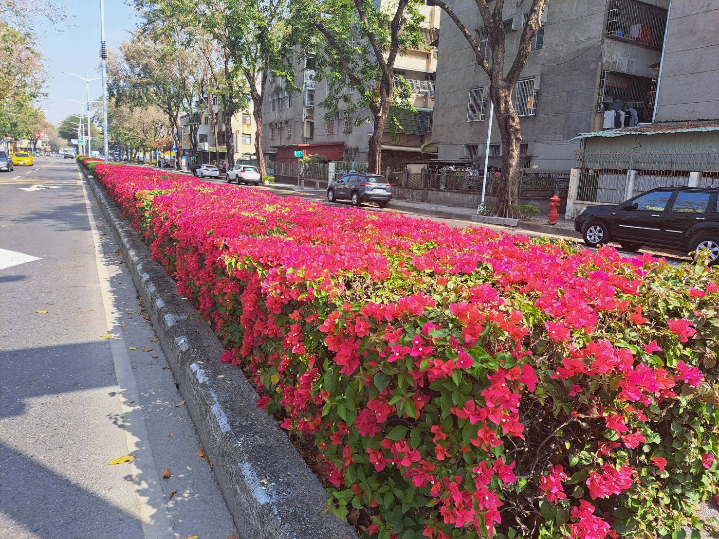 ↑圖說:滿開的九重葛,奼紫嫣紅點綴在高雄的街道(圖片來源:高雄市工務局提供)