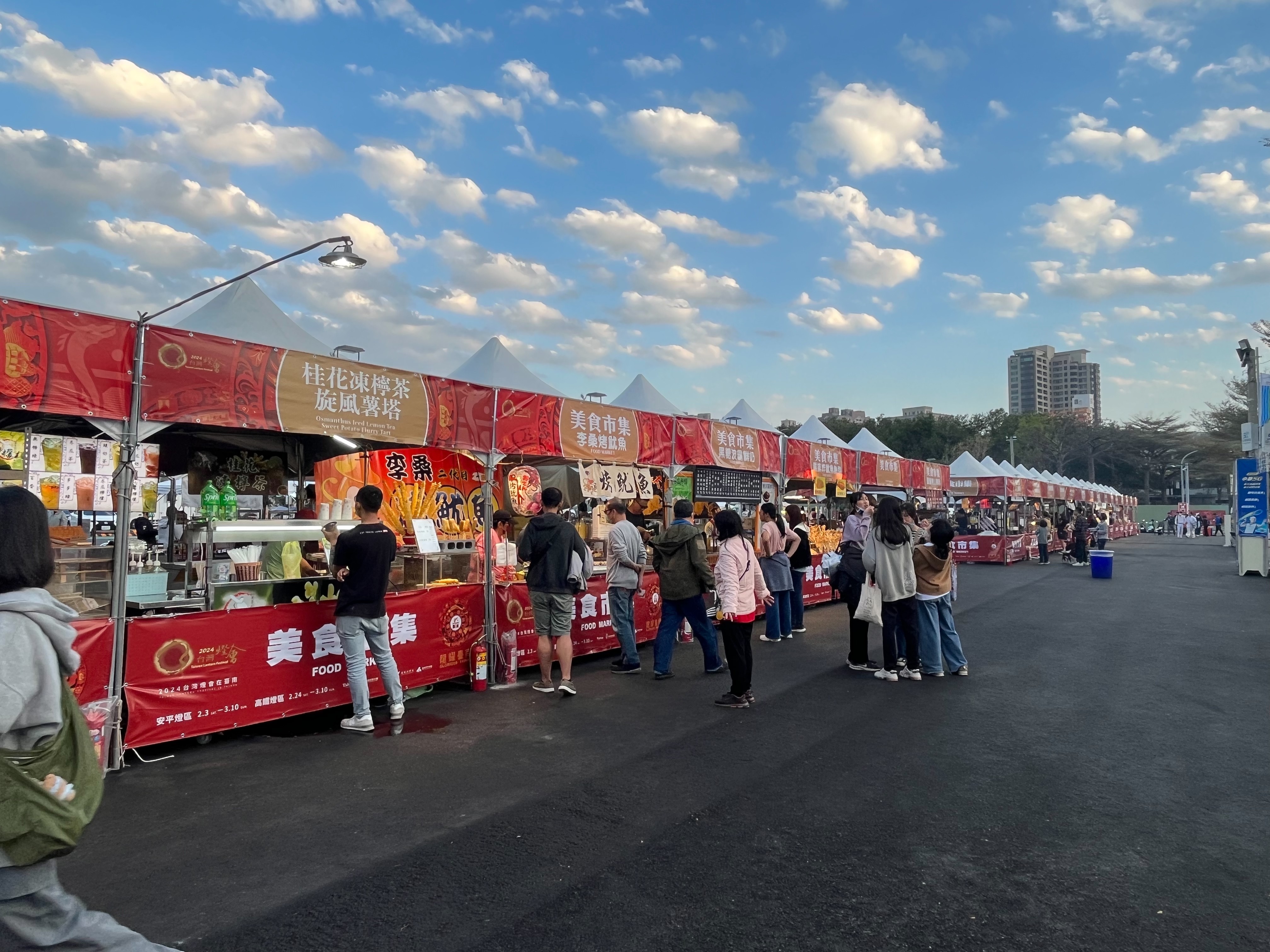 台南市府補充,為讓遊客一次性品嚐臺南美食,這次台灣燈會集結了臺南在地特色小吃,於安平藝術燈區設置50攤,高鐵燈區設置100攤,兩個燈區的美食各有特色,如安平藝術燈區的皇品排骨酥,以香脆多汁的排骨酥聞名,還有以新鮮地瓜製作,外酥內軟的拔絲地瓜,是夜市的始祖攤位,此外,還有傳統府城炒米粉、地瓜球等在地小吃。