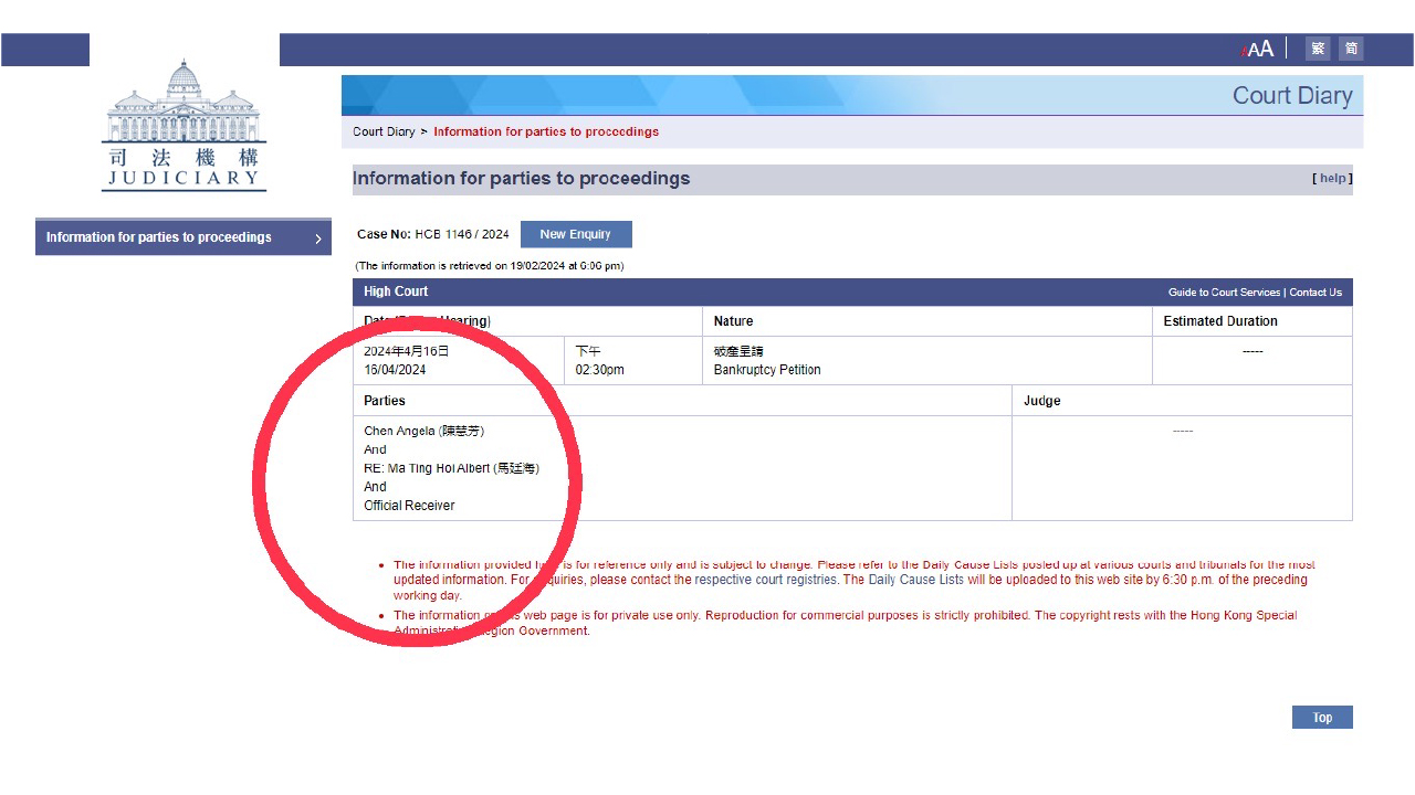 ↑圖說:香港法院19日晚上公布陳慧芳聲請對馬廷海頒布破產令。(圖片來源:翻攝自香港高等法院第一審法院)
