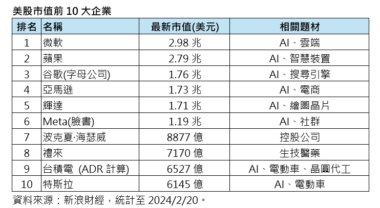統一投信指出,比較前一年同期市值榜單,破兆美元企業當時僅有微軟、蘋果、谷歌(母公司Alphabet)等3家,今年新增輝達、亞馬遜、Meta(臉書)。同時,今年新進榜前10大的企業包括:Meta、禮來,掉出榜外的則為往年常踞榜上的VISA、聯合健康保險集團、埃克森美孚石油公司,可以看出主流AI題材助長了科技巨擘的市值暴風式成長,並超車取代了傳統大企業,掀起市值排名更迭。