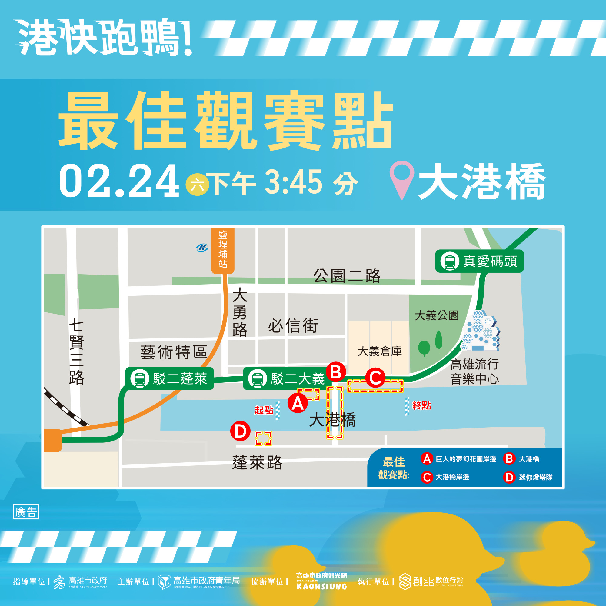 ↑圖說:2月24日「港快跑鴨!」大港橋周邊最佳觀賽地點。(圖片來源:高雄市青年局提供)