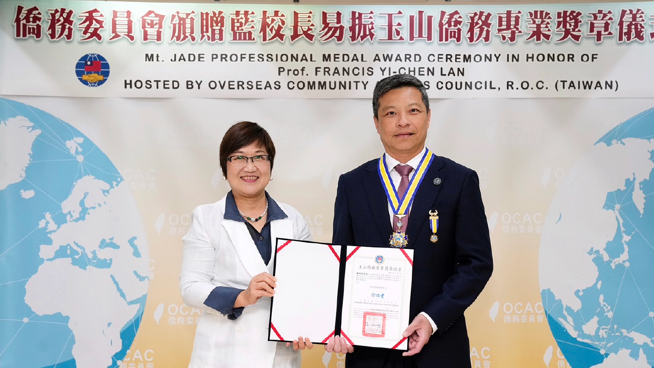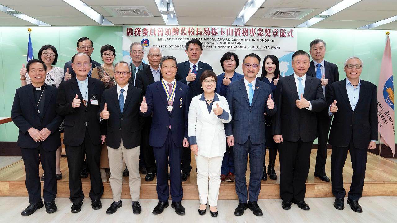 表揚推展國際外交及僑民教育特殊重大功績的僑委會「玉山僑務專業獎章」,僑委會委員長徐佳青委今年授予天主教輔仁大學校長藍易振教授,表彰藍校長過去三十年來對教育和學術界的卓越貢獻!藍校長這項殊榮,肯定他長期推廣台澳教育以及公眾外交的努力,也為輔仁大學帶來了教育無上光榮的開端。