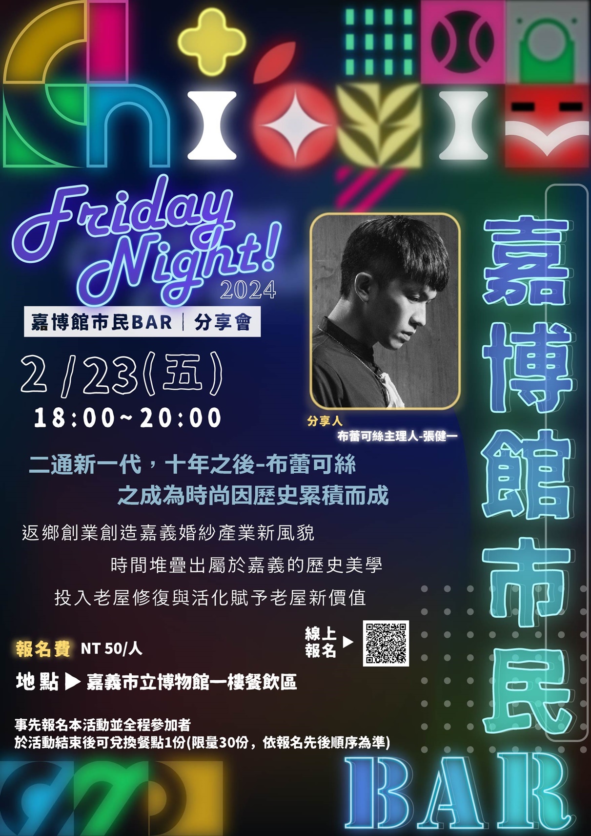 自2023年9月起嘉博館於每月最後一周周五晚上特別舉辦市民BAR分享會,邀請從事各行各業的市民朋友、返鄉創業青年或主理人進行活動帶領,分享在嘉的經營理念及創業過程,活動迄今已邀請過秘密客品牌總監Miva、林聰明沙鍋魚頭的執行長林佳慧、CASA酒吧主理人小毛、白水設計總監李金源、往前咖啡主理人馬力歐、桃城豆花主理人Sam及靜山設設計的陳煥軒等多位在地創業青年分享創業的秘辛。