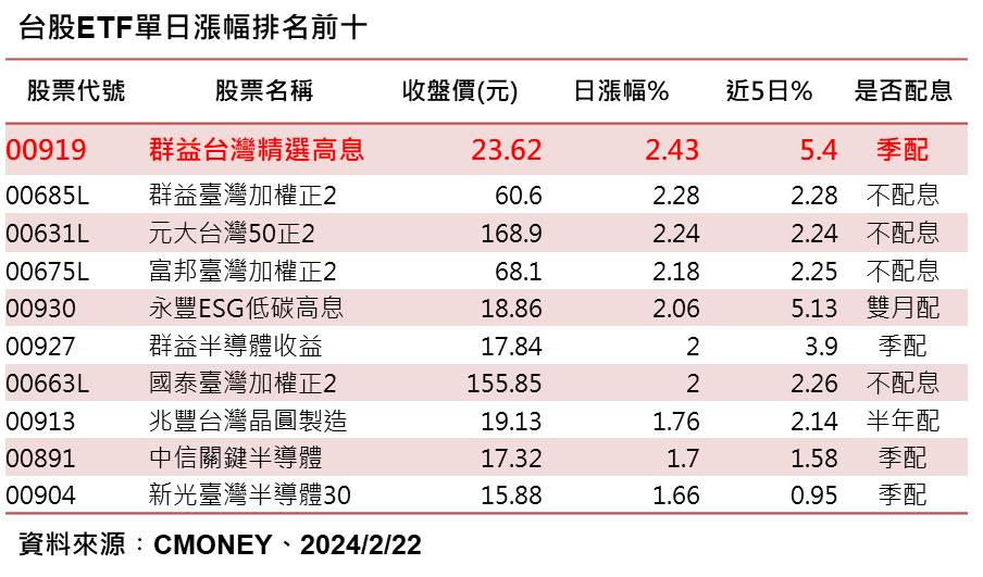 台股ETF同慶!00919今漲2.43%居冠 前10強一表看懂