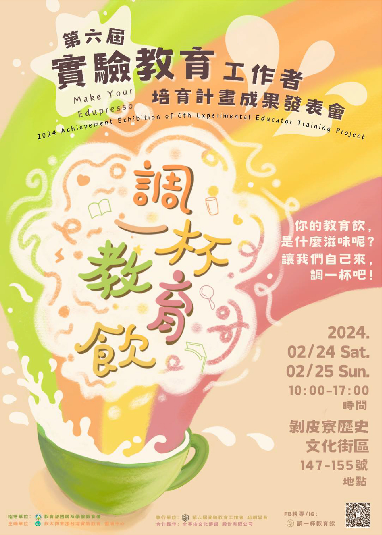 第六屆實驗教育工作者培育計畫成果發表會,《教育部實驗教育推動中心》於2月24日、2月25日週六日兩天,在台北市剝皮寮歷史文化街區舉辦。除了回顧影片、名人座談會,還邀請民眾參加展場任務「自己調一杯教育飲」。說出通關密語闖關體驗,還有機會獲得精美小禮。