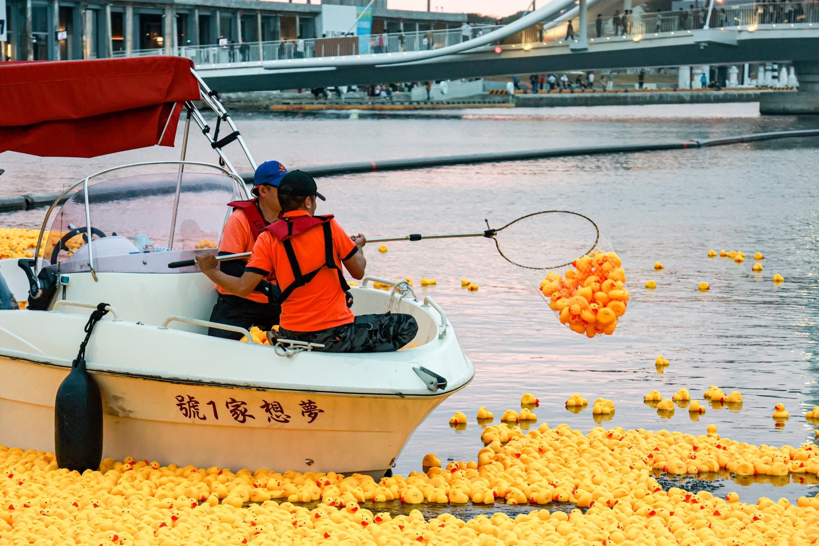 圖說:活動結束後,工作船馬上打撈所有小鴨以利後續發送,確保無「漏網之鴨」。(圖片來源:高雄市青年局提供)