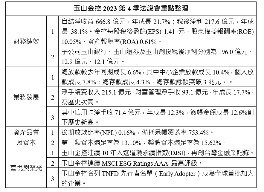 玉山銀2023年放款餘額成長6.6%,中小企業放款成長10.4%,ESG永續授信餘額現已占整體法金放款35.9%,其中ESG linked loan成長48.0%、綠色授信餘額成長46.3%;2023年底逾期放款比率(NPL)為0.16%,備抵呆帳覆蓋率753.4%。