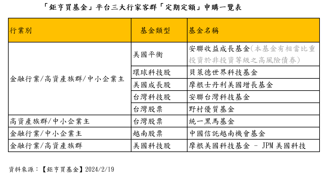 高資產客戶及企業老闆偏好投資那些基金?根據「鉅亨買基金」投資研究團隊交叉比對平台客戶資料,分析「金融產業」、「高資產族群」和「中小企業主」三大行家,定期定額偏好的資產,以「美國平衡」、「環球科技股」、「美國成長股」、「台灣科技股」、「台灣股票」等類型基金為主。