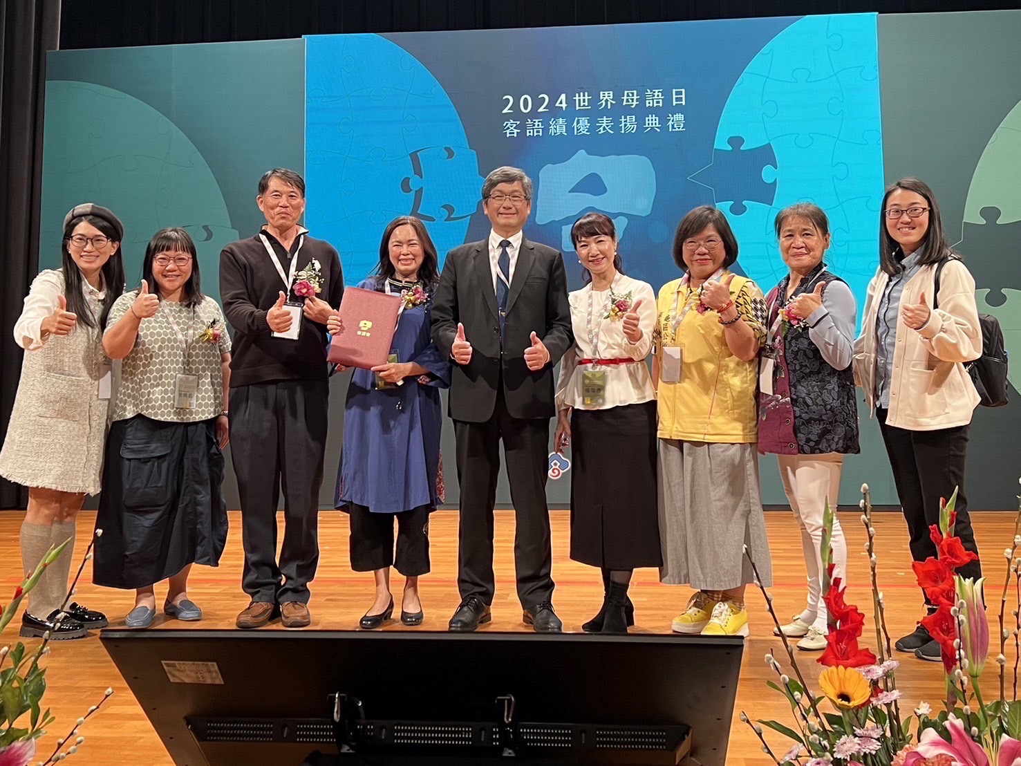 ↑圖說:高雄市政府與美濃、杉林、六龜及甲仙等4區以客語為通行語區之區公所、在地教師上台領獎(圖片來源:高雄市客家事務委員會提供)