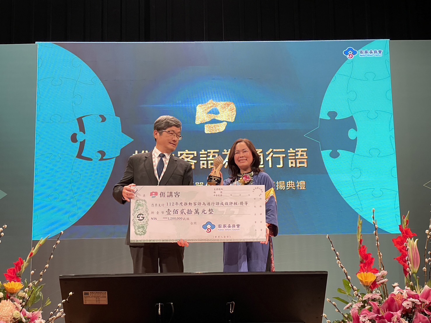 ↑圖說:高雄市政府獲得佳等及獎勵金100萬元整,由楊瑞霞主任委員出席領獎(圖片來源:高雄市客家事務委員會提供)