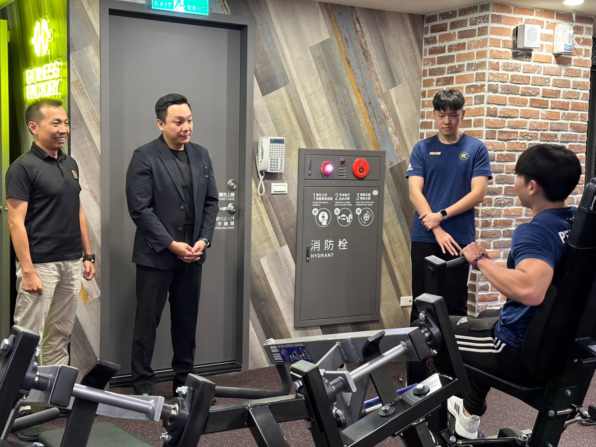 ↑圖說:健身工廠實習生(右一)向青年局局長張以理 (左二)及健身工廠總經理林洵賢 (左一)示範如何正確操作健身器材。(圖片來源:高雄市青年局提供)