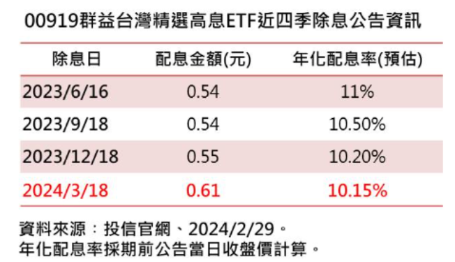 擁有53萬位受益人的群益台灣精選高息ETF(00919),3月要配息囉!據群益投信官網最新配息公告顯示,00919本次預估配發0.61元,若以今天收盤價24.03元來算,單次殖利率約2.54%,年化配息率10.15 %,連續四季衝破10%。