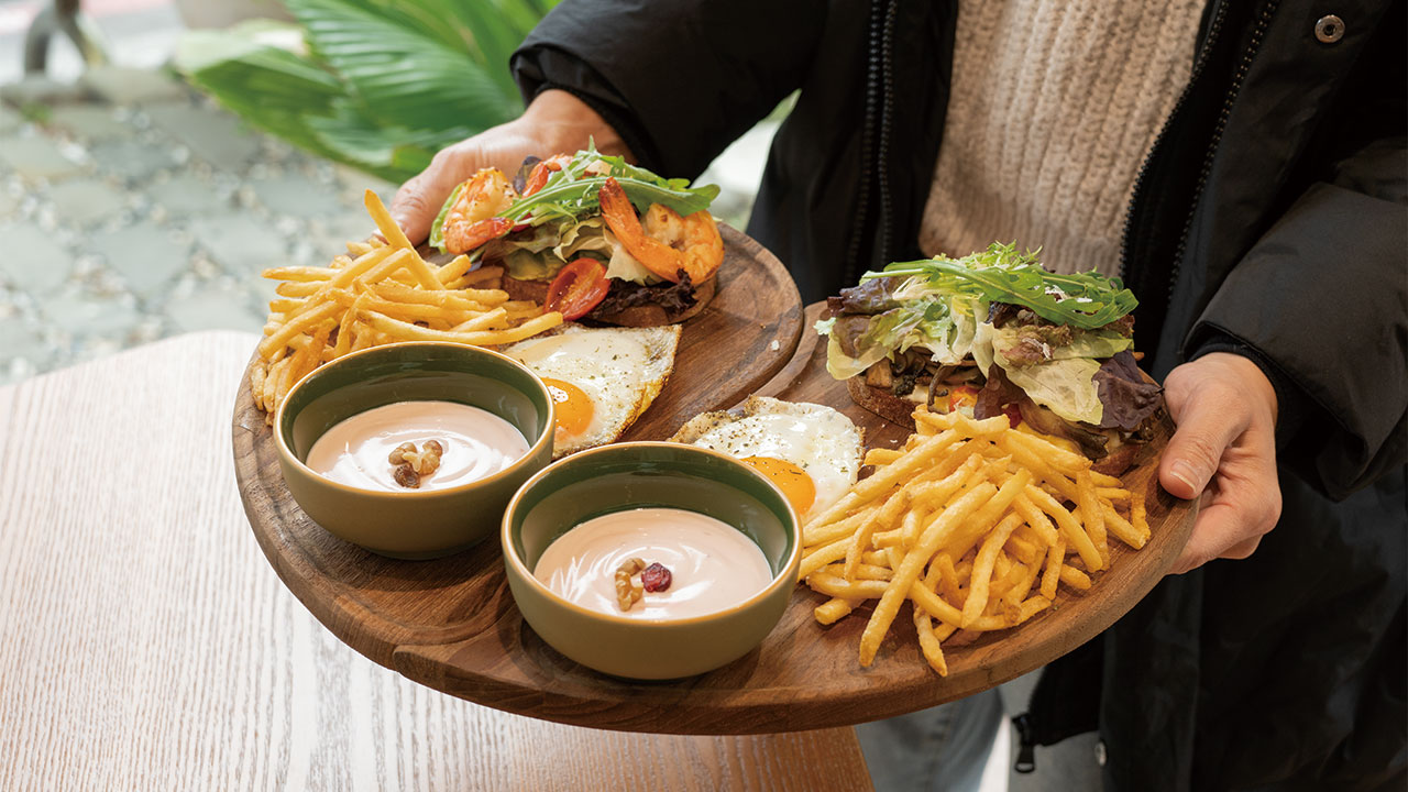 開放式三明治可選擇兩種口味(總共有五種可挑選),我選的是菌菇炒蛋跟鮮蝦水蜜桃優格。