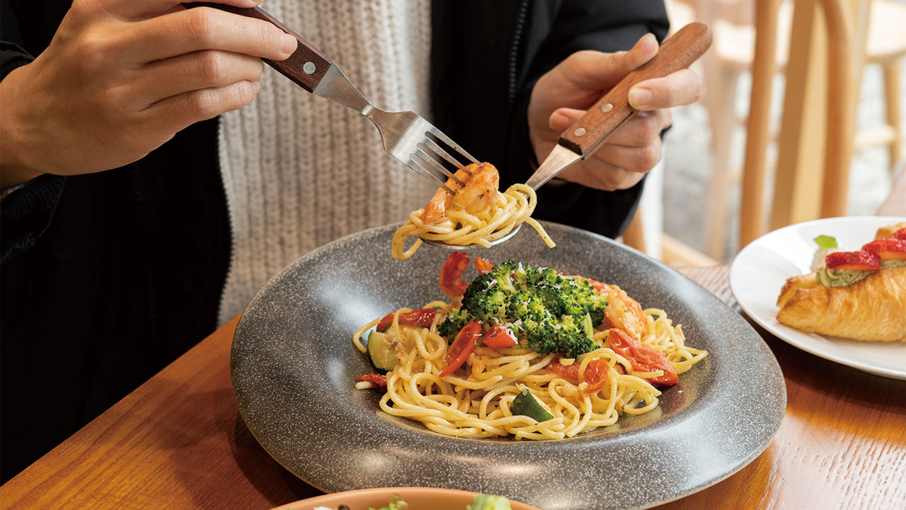除了雙人套餐還有主餐可以選購!義大利麵吃起來有Q度跟嚼勁,蝦子的鮮甜再帶一點蒜香,蔬菜有花椰菜、蕃茄、櫛瓜,吃起來有些烤過的風味。