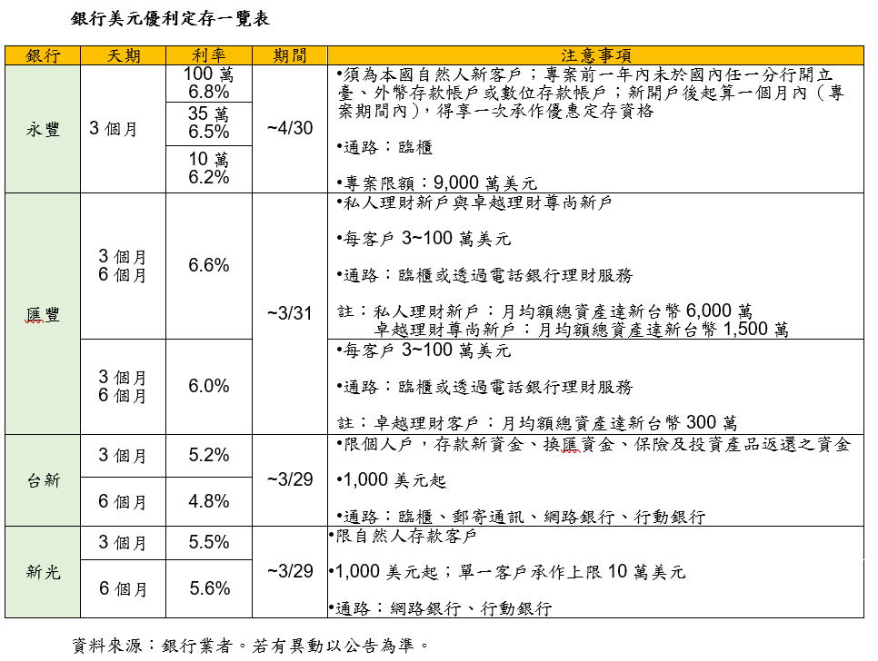 鎖定高端客戶,永豐銀行自即日起至4月30日,推出「新尊榮理財貴賓美元優利定存專案」,凡是全新客戶開戶後1個月內申辦,可於分行臨櫃承作金額100萬美元、3個月期定存年利率6.8%;自他行匯入外幣資金承作者,可享一次匯入匯款免收手續費優惠。另有35萬及10萬美元、3個月期定存年利率優惠;專案總額度9000萬美元,額滿即止。
