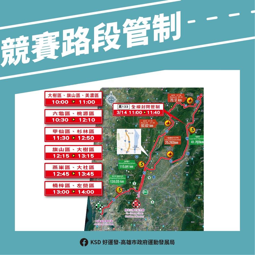 2024國際自由車環台公路大賽將於3月10日至14日在台灣舉辦,最終決勝站第五站-高雄站賽事將於14日(四)上午10時登場,本賽事為國際自由車總會UCI一級賽事、亞洲自由車指標性賽事,為確保賽事順利進行以及保障市民、行人安全,賽事所經賽道將逐區進行階段性路段管制,屆時民眾出門要留意交通管制資訊。