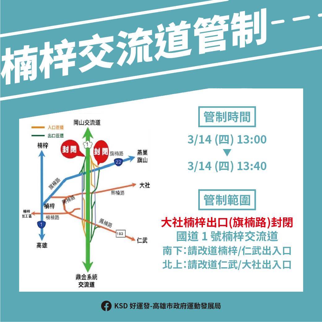 五、國道1號楠梓交流道14日下午1時至1時40分封閉管制南下大社出口(旗楠路),請民眾改下楠梓/仁武出口。