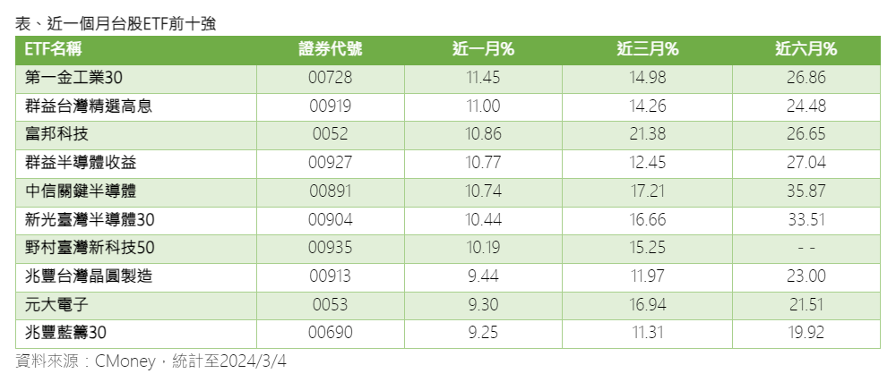 第一金工業30ETF(00728)追蹤投資臺灣工業精英30指數投資,2月底投資產業六成以上持股為半導體股,前兩大持股為台積電、聯發科,年初至今股價表現也一路強勢上攻,統計至昨(4)日止,2檔個股的漲幅分別高達22%與13%,超越台股同期間的7.67%,挹注基金績效表現。