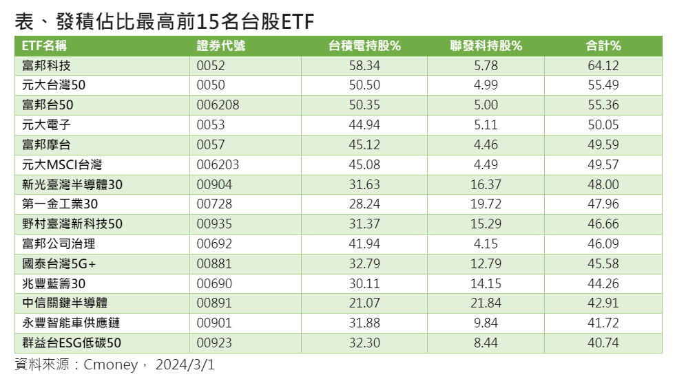 檢視市面上共有15檔台股ETF,重押台積電、聯發科,投資比重合計超過40%,堪稱是「高發積」台股ETF。