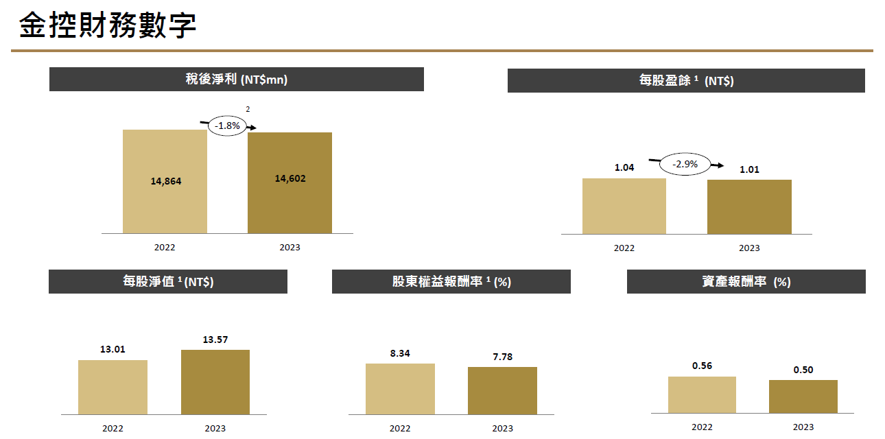 台新金2023 年稅後淨利146 億元,衰退1.8%,如果排除前年一次性因素(併購保德信人壽的廉價購買利益),獲利其實是年成長28.6%。
