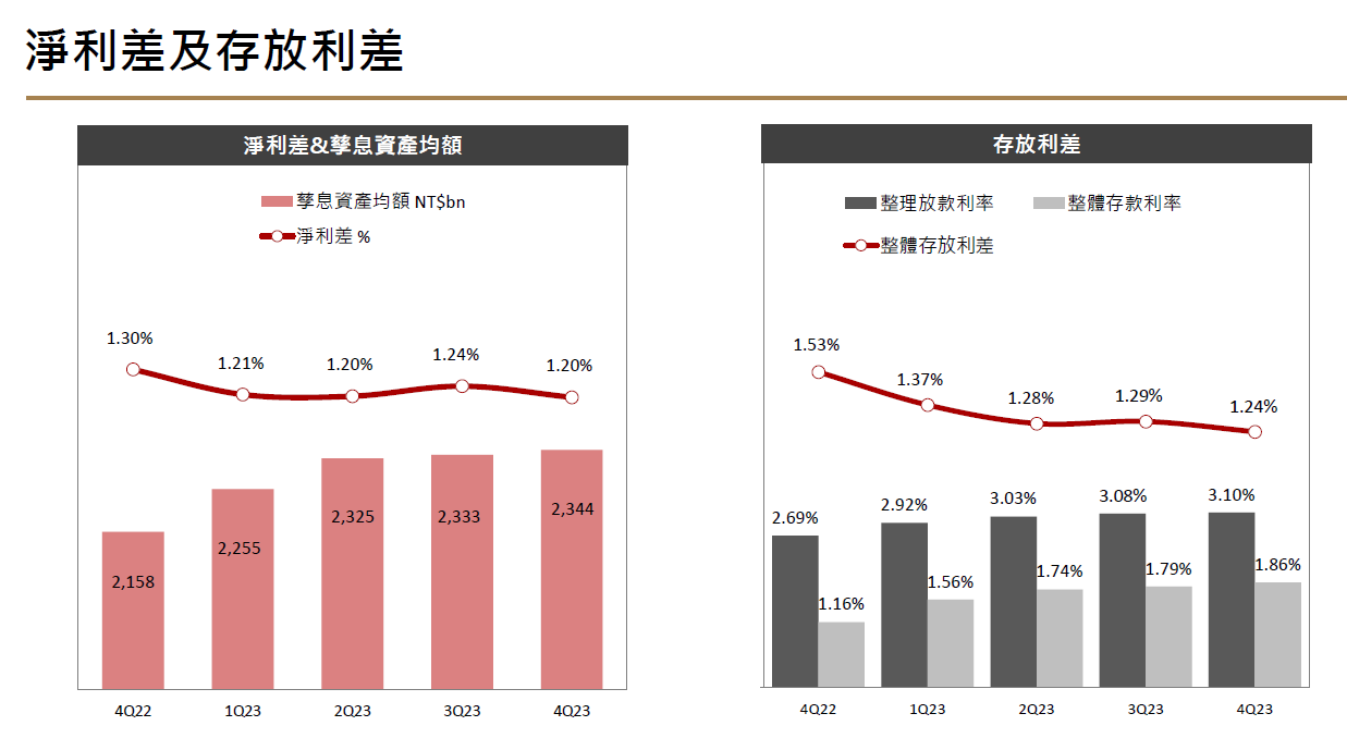2023年淨利息收入261億元,年成長 0.1%,第四季淨利差(NIM)1.2%,放款年成長7.7%。