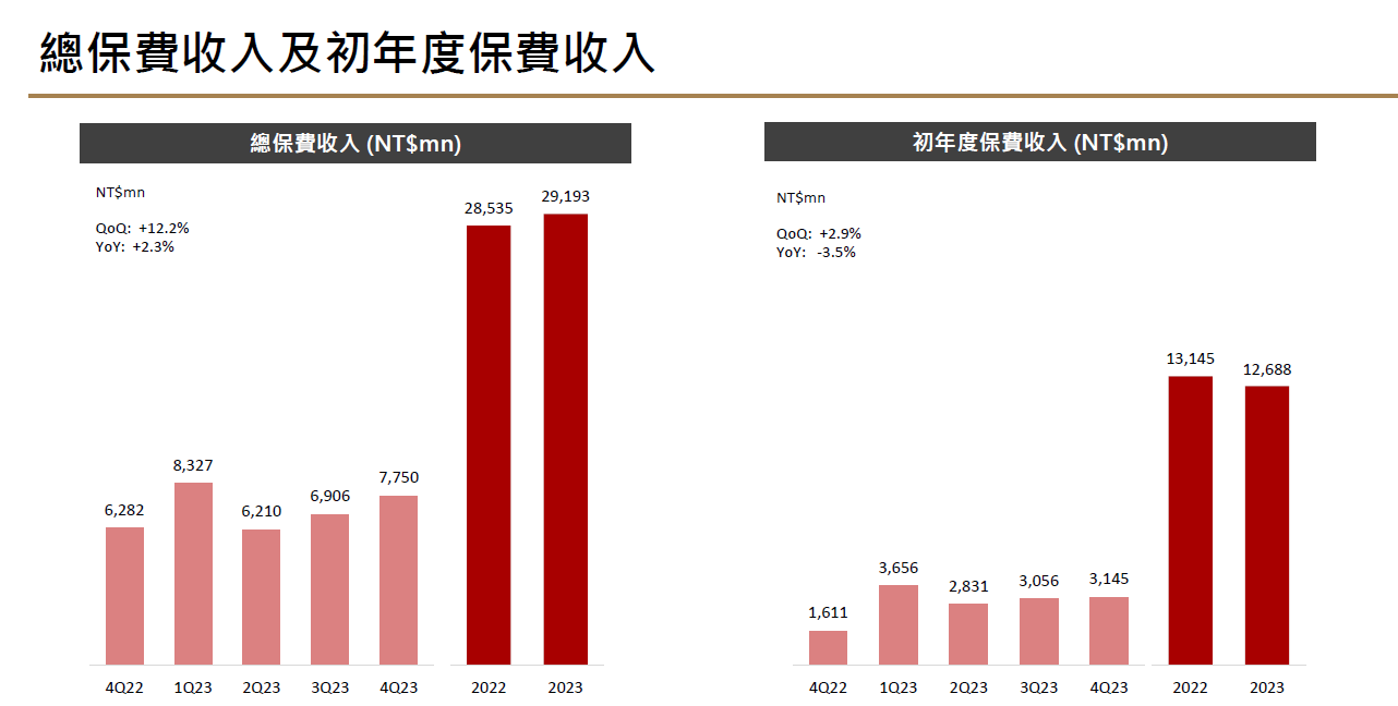 2023年初年度保費126.9 億元,初年度保費收入市佔率1.89%,業界排名 13,均較2022年底成長。
